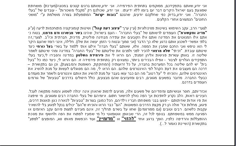 אמרתי ואני אומר שוב ובכל הזדמנות: אם מישהו מכם מוכן להעיר לי הערות ענייניות או לשאול שאלות ואפילו לתקוף בצורה עניינית אני מוכן לענות.